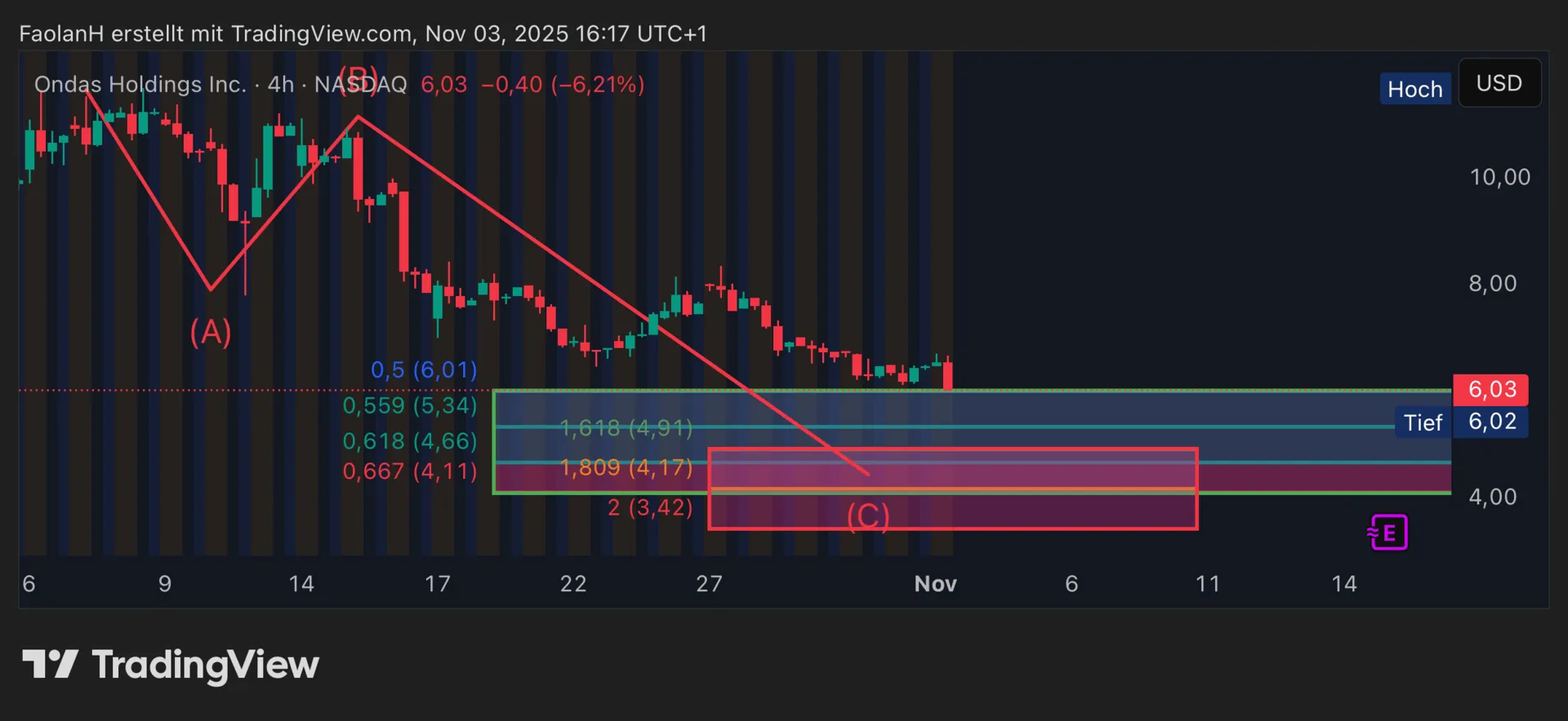Aktuell befinden wir uns im ersten relevanten Supportbereich zwischen 6 USD und 4,11 USD.