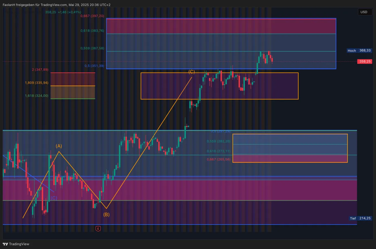 Kurz darauf folgte ein hypegetriebener Anstieg (rote Sequenz), ausgelöst durch den Wahlsieg von Donald Trump. Diese Bewegung katapultierte den Kurs direkt in die übergeordneten Ziellevel bei 458,33 USD, wo ich persönlich 75 % meiner Positionen verkauft und dies auch transparent in der Gruppe mitgeteilt habe.