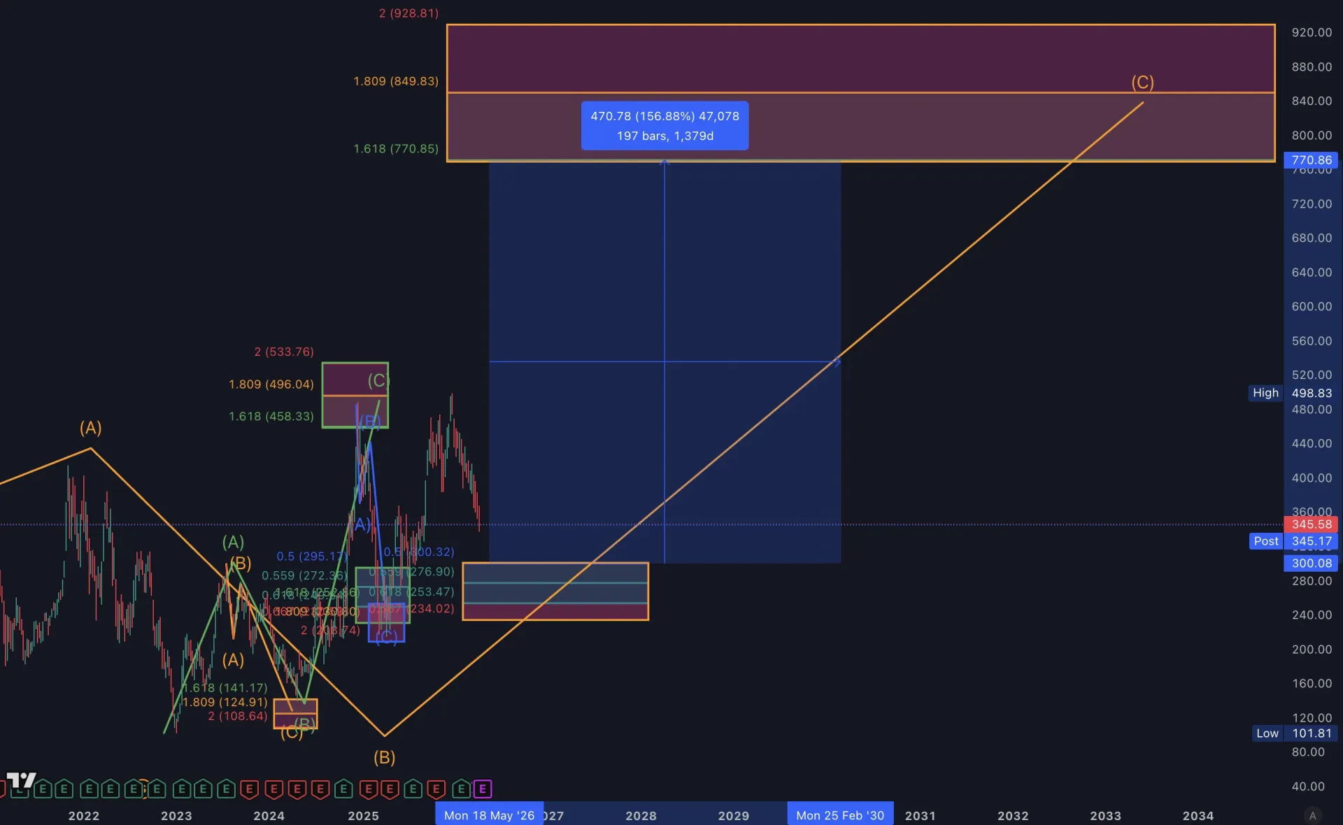 In dieser Zone erwarte ich die Ausbildung eines mittel- bis längerfristigen Bodens. Von dort aus ergeben sich attraktive Kursziele im Bereich von 770$ bis 930$, was bereits vom oberen Support-Bereich aus einer möglichen Rendite von über +150% entsprechen würde. Sollte die Aktie tiefer in den Support fallen und sich anschließend in Richtung 930$ entwickeln, wären sogar Renditen von über +250% möglich.