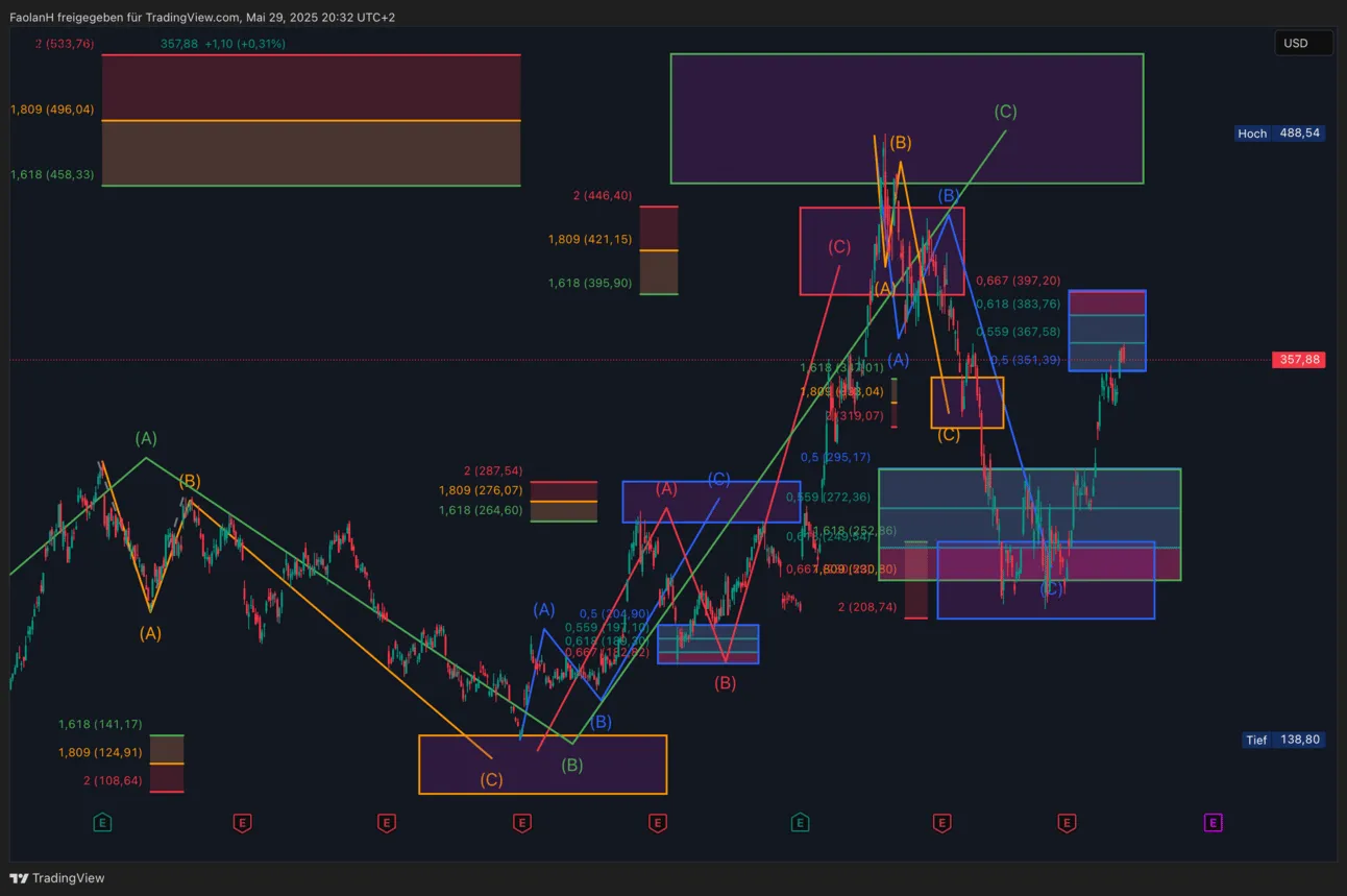 Kurz darauf folgte ein hypegetriebener Anstieg (rote Sequenz), ausgelöst durch den Wahlsieg von Donald Trump. Diese Bewegung katapultierte den Kurs direkt in die übergeordneten Ziellevel bei 458,33 USD, wo ich persönlich 75 % meiner Positionen verkauft und dies auch transparent in der Gruppe mitgeteilt habe.