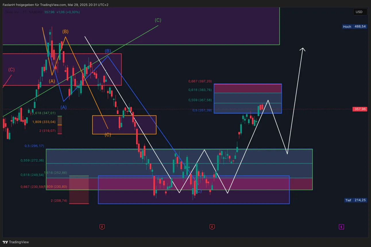 Tesla steht aktuell an einem technisch wichtigen Punkt, an dem sich mehrere übergeordnete Widerstände und Zielzonen überschneiden. Eine zwischenzeitliche Korrektur erscheint daher sehr wahrscheinlich. Es ist aber wichtig zu wissen, dass sich diese Analyse um eine kurzfristige Analyse handelt, die nicht so eintreten muss.